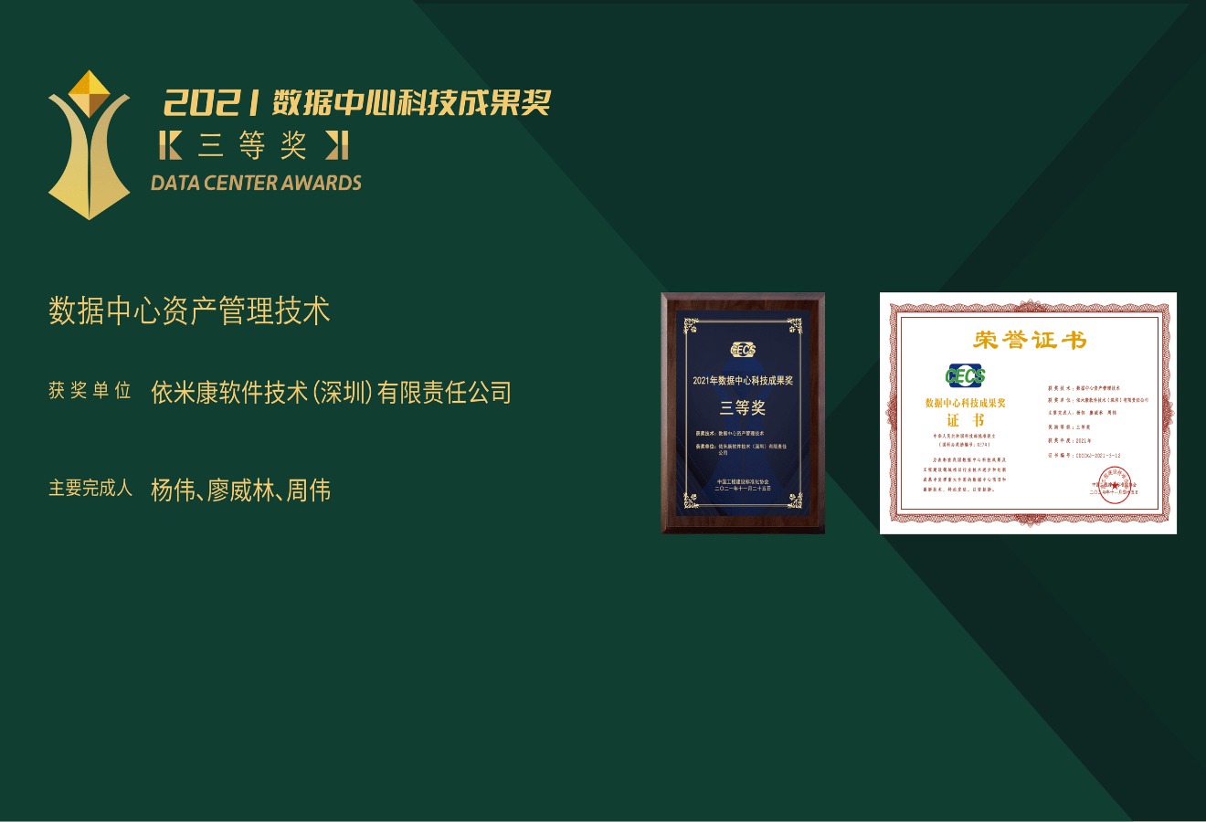 本屆峰會還隆重揭曉了新一年數(shù)據(jù)中心科技成果獎,依米康·龍控憑借「數(shù)據(jù)中心資產(chǎn)管理技術(shù)」成功摘獎!數(shù)據(jù)中心科技成果獎經(jīng)科技部國家科學(xué)技術(shù)獎勵辦公室批準(獎勵編號:0274),旨在表彰數(shù)據(jù)中心領(lǐng)域先進科學(xué)技術(shù)及為數(shù)據(jù)中心行業(yè)做出突出貢獻的單位和個人。此次依米康·龍控成功摘獎,印證了行業(yè)對依米康·龍控資產(chǎn)管理產(chǎn)品技術(shù)及應(yīng)用的充分認可。