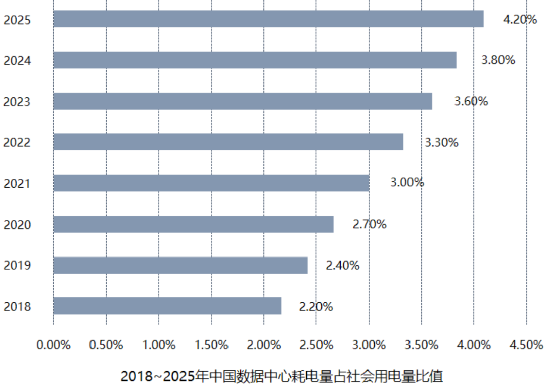 隨著人工智能、物聯(lián)網(wǎng)、云、5G等新技術(shù)的迅速推廣和應(yīng)用,結(jié)合“新基建”、“數(shù)字中國”的政策導(dǎo)向,我國數(shù)據(jù)中心行業(yè)持續(xù)保持快速的市場增長。相應(yīng)的,數(shù)據(jù)中心耗能也大幅增加,據(jù)第三方調(diào)研數(shù)據(jù)顯示,2021年我國數(shù)據(jù)中心耗電量超2000億千瓦時,占全國總用電量的3%左右,預(yù)計到2025年將突破4%,儼然成為了我國第九大高能耗產(chǎn)業(yè)。